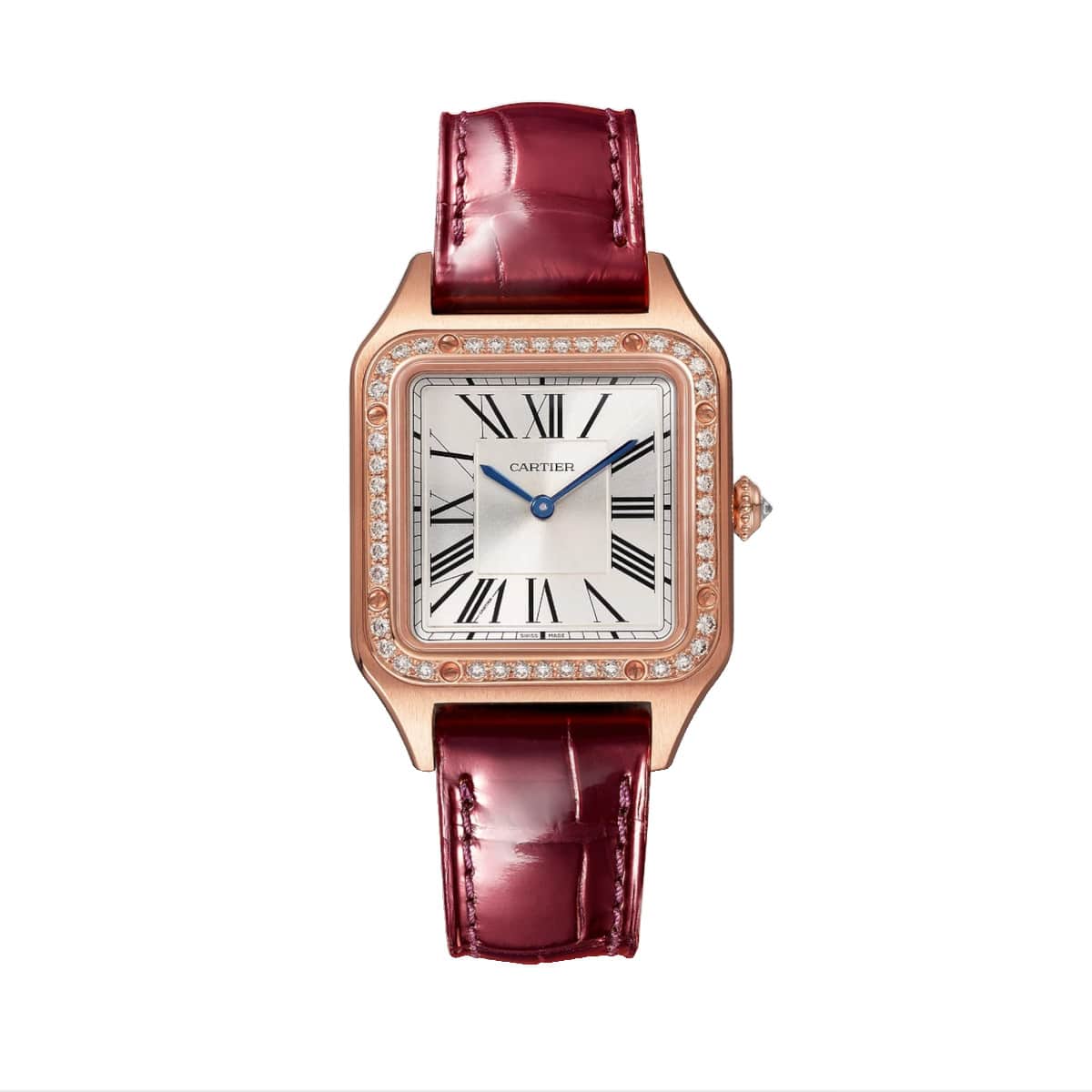 Cartier Santos-Dumont WJSA0017 Silvered Sunray Dial Diamond-Set Bezel Alligator-Skin Strap Small Santos-Dumont watch, small model, high autonomy quartz movement (~ 6 years). Rose gold 750/1000 case, bezel set with 44 brilliant-cut diamonds and beaded crown set with one brilliant-cut diamond…