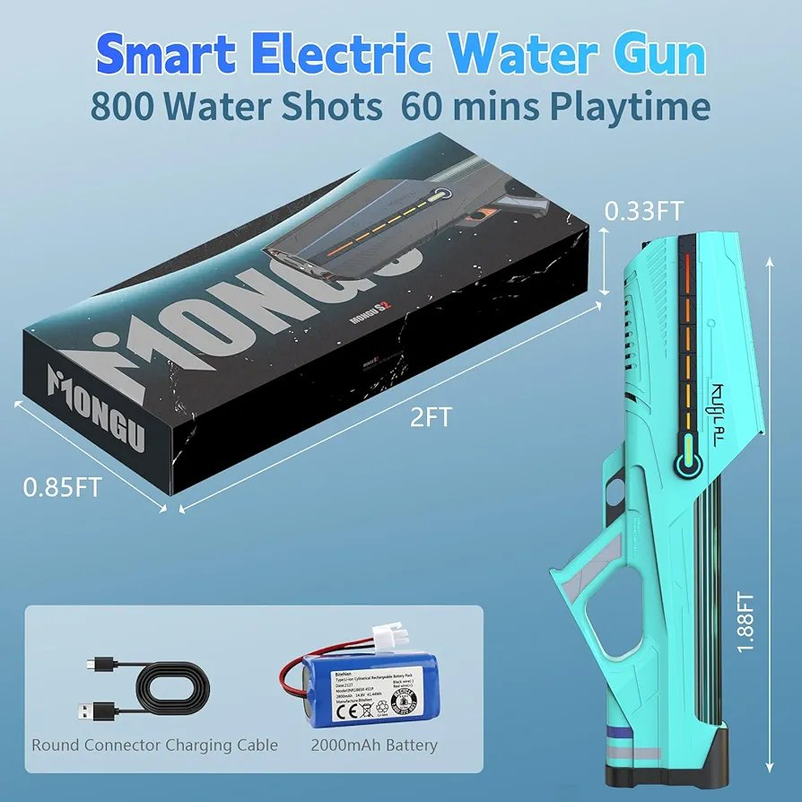 Futuristic Design with LED Lights & Sound Effects: Stand out in every water battle with a sleek, modern look enhanced by vibrant LED lights and dynamic sound effects. The built-in smart display shows real-time battery status, ensuring you’re always ready for action