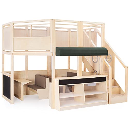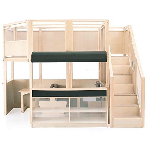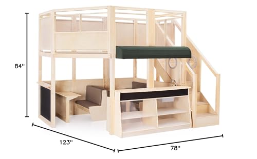 - MULTI-LEVEL SENSORY LOFT: Kids’ indoor loft features a pretend play kitchen area and authentic café details like a chalkboard for menus, a fabric awning and booth-like seating