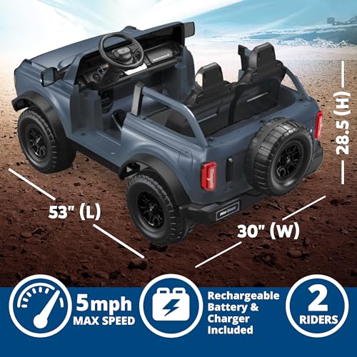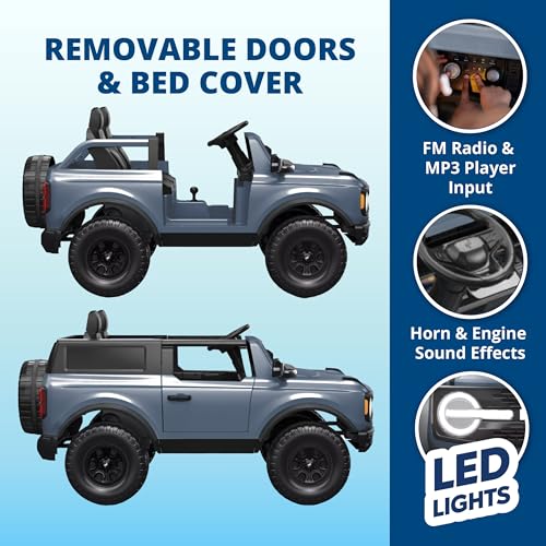 • TWO RIDERS, OFFICIALLY LICENSED: The Kid Trax 12V Ford Bronco brings the excitement of the great outdoors right to your driveway. Perfect for kids aged 3-7, this battery-powered ride-on toy features two speeds, 2.5 MPH for leisurely rides and 5 MPH for more thrilling adventures, making it ideal for backyard journeys and sidewalk safaris. With a max weight limit of 130 lb, it’s the perfect vehicle for little adventurers eager to explore their world together. Features removable doors and bed cover