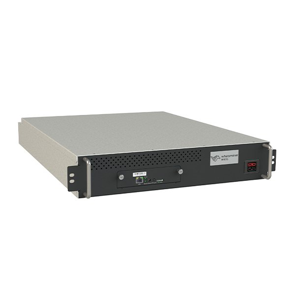 Model WhatsMiner M63S from MicroBT mining SHA-256 algorithm with a maximum hashrate of 408Th/s for a power consumption of 7344W.